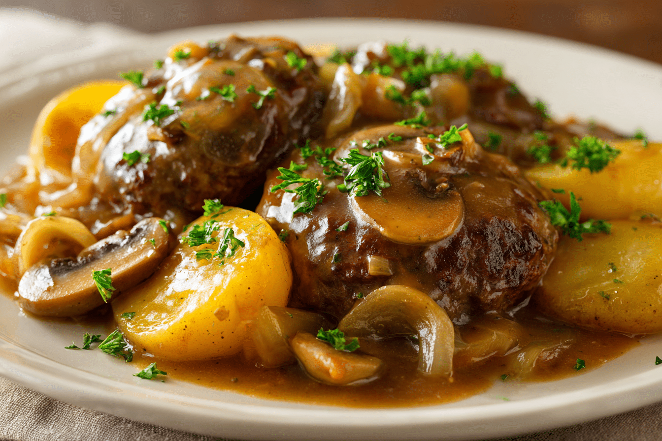 Hamburger steak is essentially seasoned ground beef shaped into thick patties, seared or baked, then covered in a rich gravy or sauce. In this baked version, everything comes together in a single dish: juicy hamburger patties, creamy mushroom or onion gravy, and often a topping of crispy onions or potatoes. It’s filling, flavorful, and incredibly easy to make — perfect for cold nights, potlucks, or meal prepping for the week.