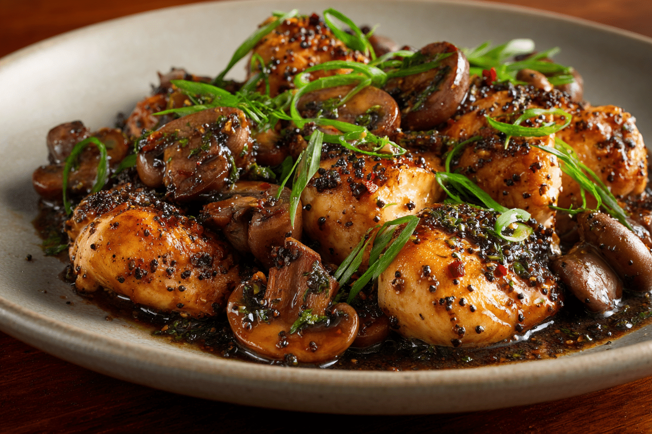 PrintDescription: A bold, savory stir-fry of tender chicken and earthy mushrooms tossed in a glossy, peppery sauce — fast, flavorful, and perfect for rice or noodles.
