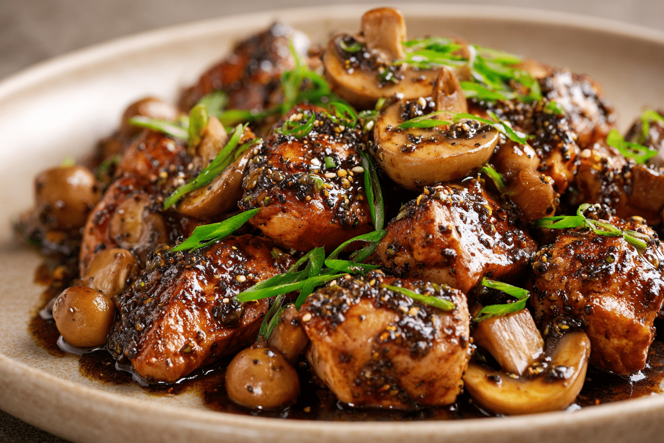 PrintDescription: A bold, savory stir-fry of tender chicken and earthy mushrooms tossed in a glossy, peppery sauce — fast, flavorful, and perfect for rice or noodles.
