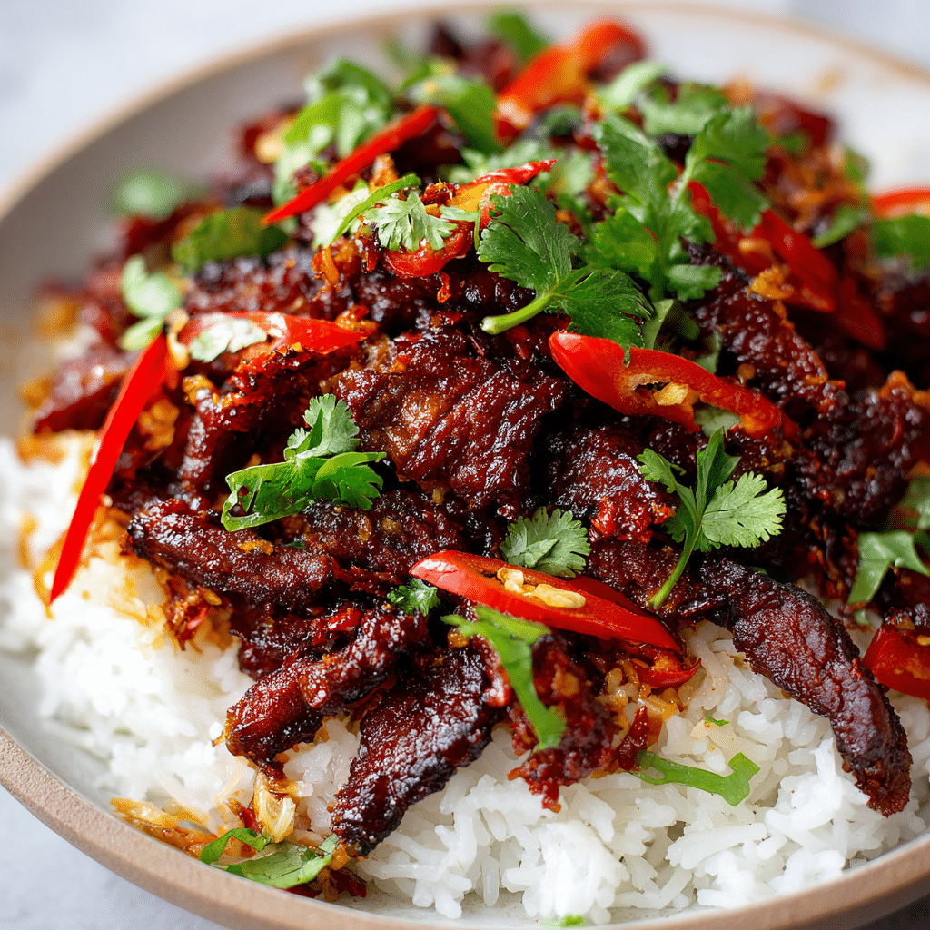 Crispy Chilli Beef Rice is a bold and flavorful fusion dish that brings together the crunch of deep-fried beef strips, the heat of chili sauce, and the comfort of fluffy …