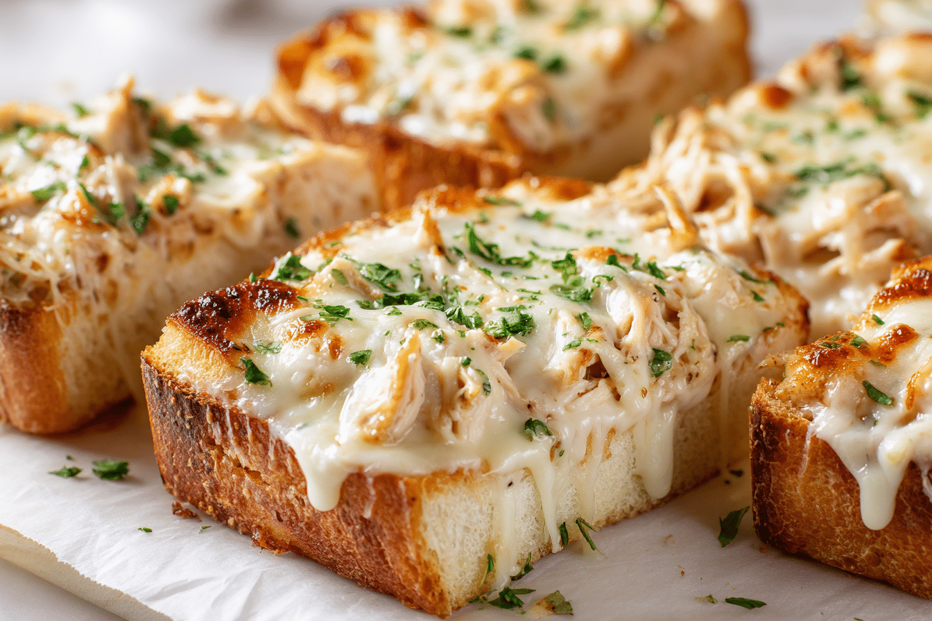 Creamy, cheesy Chicken Alfredo Garlic Bread combines tender shredded chicken, rich Alfredo sauce, and melted mozzarella on crispy, garlicky French bread for an irresistible comfort dish.