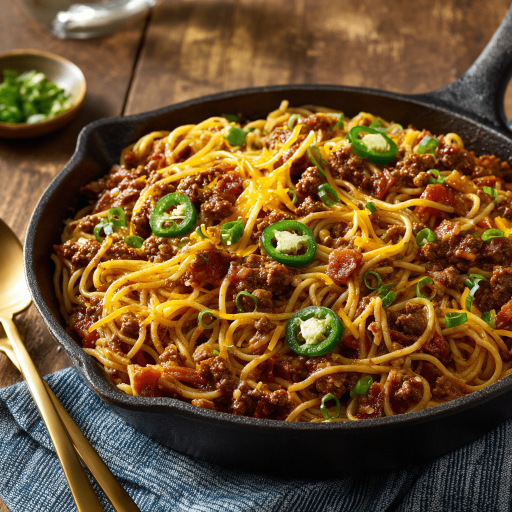 Cowboy Spaghetti is a bold, no-frills twist on traditional spaghetti that swaps out Italian herbs for smoky bacon, ground beef, and a rich, chili-spiked tomato sauce. It’s loaded with Western flavor—think BBQ vibes meet pasta night. This one-pan, crowd-pleasing dish is packed with protein, layered with spicy depth, and finished with sharp cheddar, green onions, and crispy bacon.
