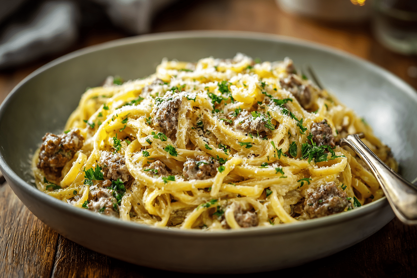 This recipe combines tender ground beef, perfectly cooked pasta, and a luscious garlic butter cream sauce that clings to every bite. It’s a comforting family favorite — simple enough for a busy Tuesday, but indulgent enough to satisfy that “need something hearty” mood.