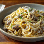 This recipe combines tender ground beef, perfectly cooked pasta, and a luscious garlic butter cream sauce that clings to every bite. It’s a comforting family favorite — simple enough for a busy Tuesday, but indulgent enough to satisfy that “need something hearty” mood.
