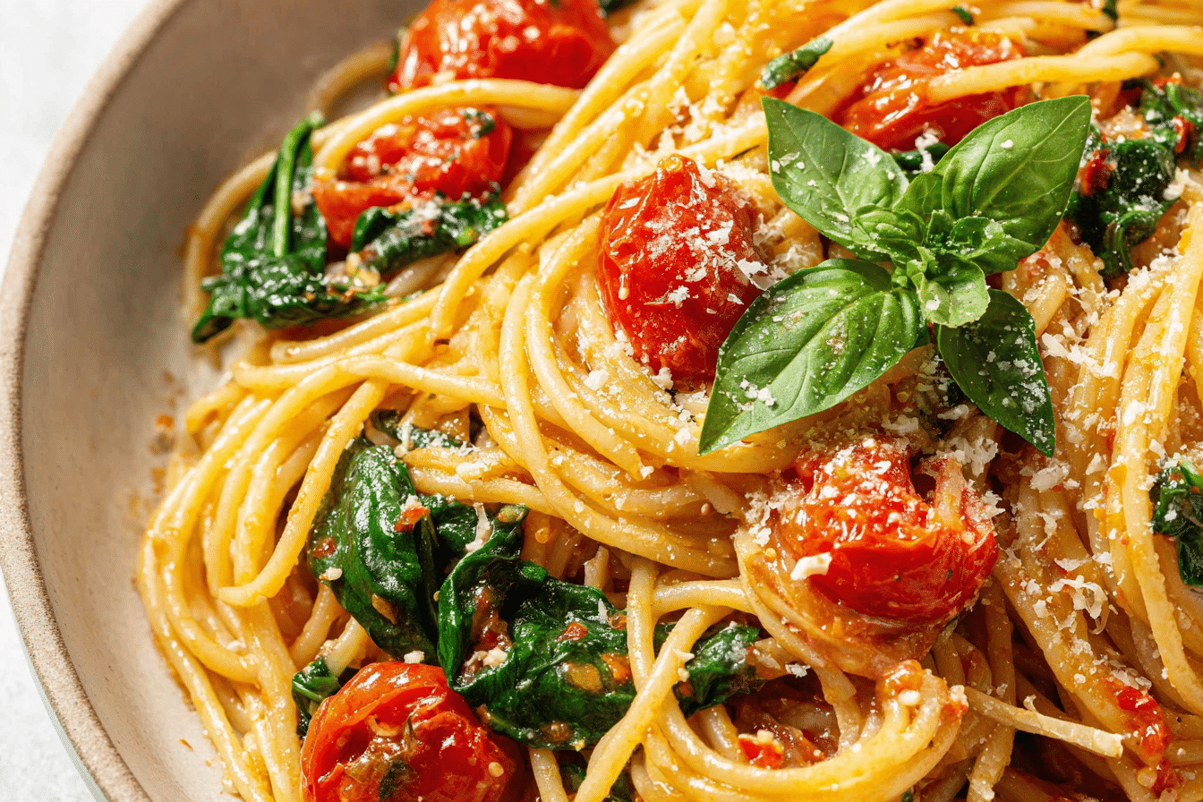 PrintA light and flavorful pasta dish made with cherry tomatoes, garlic, and baby spinach. Quick, fresh, and perfect for any night of the week.