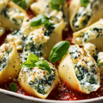 Comforting, cheesy, and packed with tender greens, these Spinach and Ricotta Stuffed Shells are the ultimate cozy vegetarian dinner. Nestled in rich marinara and baked to bubbling perfection, each pasta shell is filled with creamy ricotta, sautéed spinach, and a hint of nutmeg — making this dish both wholesome and indulgent.