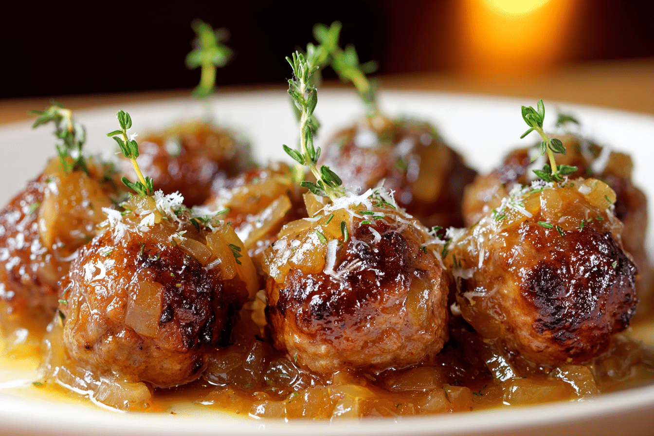 French Onion Meatballs with Savory Onion Sauce are everything you love about French onion soup—rich caramelized onions, deep umami flavor, and melty cheese—reimagined in meatball form. These juicy, tender meatballs are simmered in a luscious onion-packed sauce and often finished with melted Gruyère or Swiss cheese. The result is a comforting, elegant dish that works just as beautifully for a cozy family dinner as it does for a dinner party centerpiece.