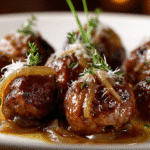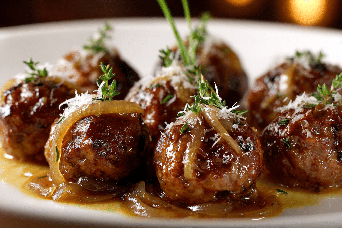 French Onion Meatballs with Savory Onion Sauce are everything you love about French onion soup—rich caramelized onions, deep umami flavor, and melty cheese—reimagined in meatball form. These juicy, tender meatballs are simmered in a luscious onion-packed sauce and often finished with melted Gruyère or Swiss cheese. The result is a comforting, elegant dish that works just as beautifully for a cozy family dinner as it does for a dinner party centerpiece.
