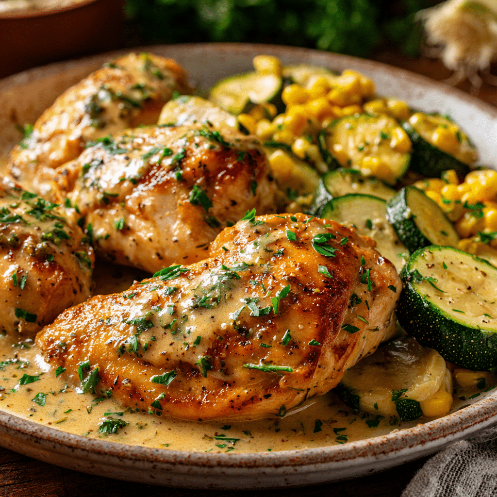 A quick and flavorful garlic butter chicken skillet with fresh zucchini and sweet corn. Ready in 30 minutes, this one-pan meal is light, summery, and deeply satisfying.
