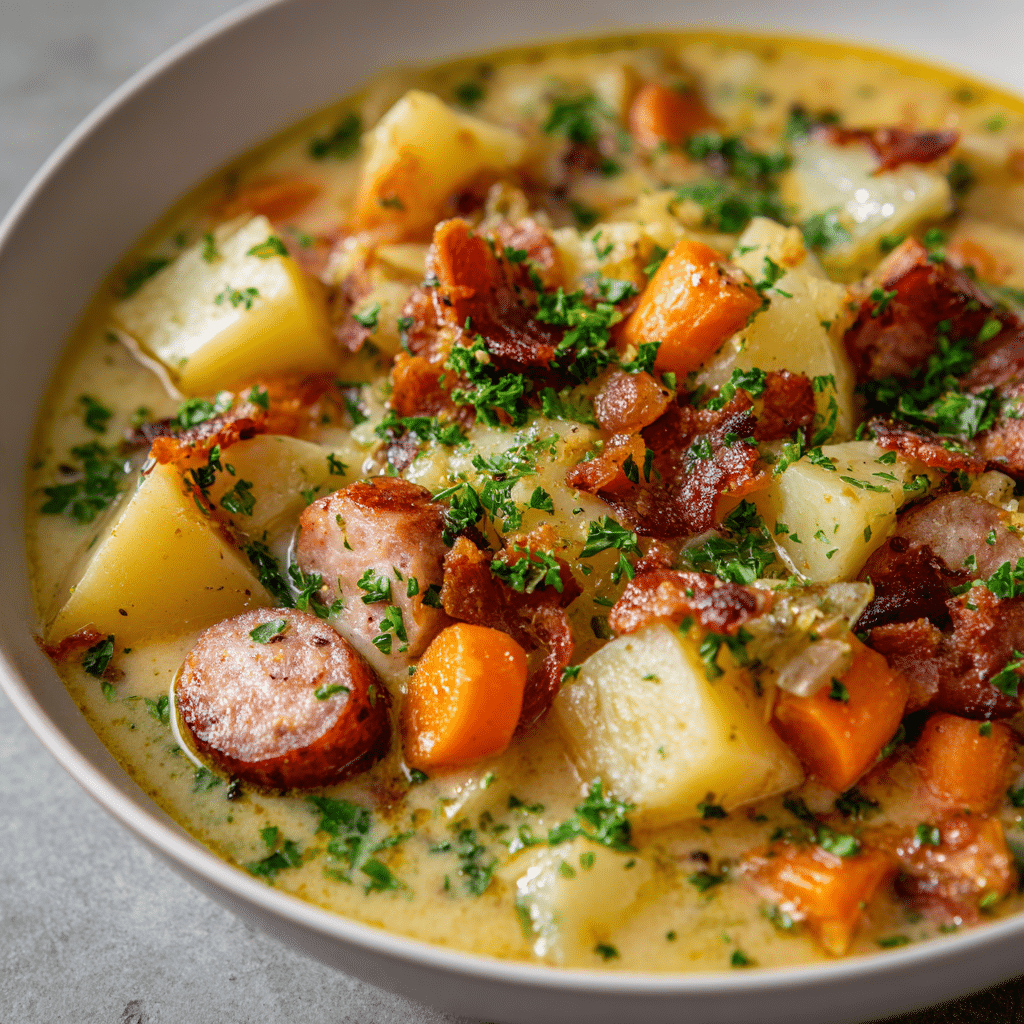 A warm and hearty German Potato Soup made with creamy potatoes, savory smoked sausage, and traditional herbs. Perfect for cozy nights or meal prep.