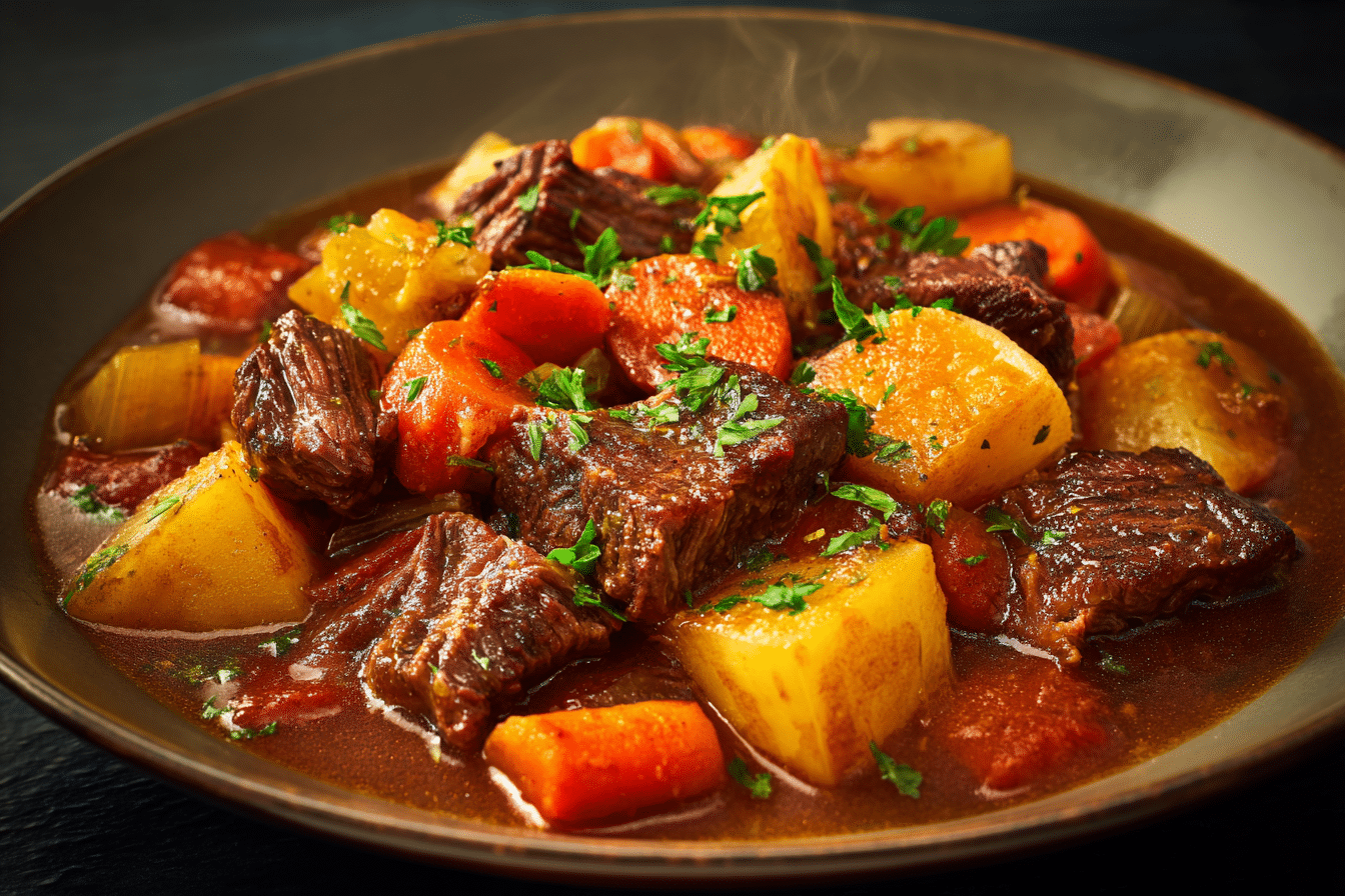 A3: Yes! After searing the beef and sautéing vegetables, transfer everything to a slow cooker. Cook on low for 7–8 hours or high for 4–5 hours. Add potatoes halfway through to prevent overcooking.
