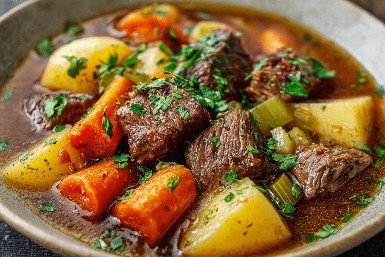 A3: Yes! After searing the beef and sautéing vegetables, transfer everything to a slow cooker. Cook on low for 7–8 hours or high for 4–5 hours. Add potatoes halfway through to prevent overcooking.