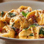 PrintA creamy, dreamy tortellini dish simmered in a garlic-Parmesan sun-dried tomato cream sauce — bold, rich, and ready in 30 minutes. Perfect for date night or family dinners.