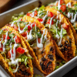 What makes them special? Everything gets baked together in one pan — the shells stay golden and crunchy, the cheese melts into every layer, and the fillings stay juicy and flavorful. Perfect for feeding a hungry family, meal prepping, or hosting casual gatherings, these tacos are the definition of loaded comfort food.