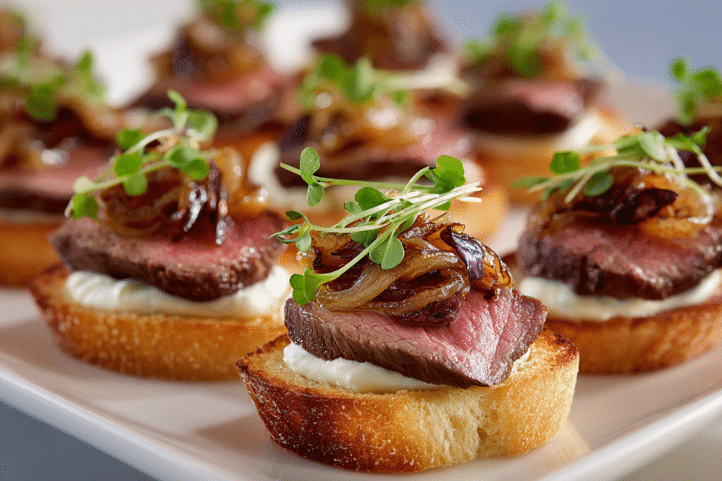 Steak Crostini with Horseradish Sauce & Caramelized Onions – Elegant, Bite-Sized Flavor Bombs