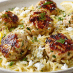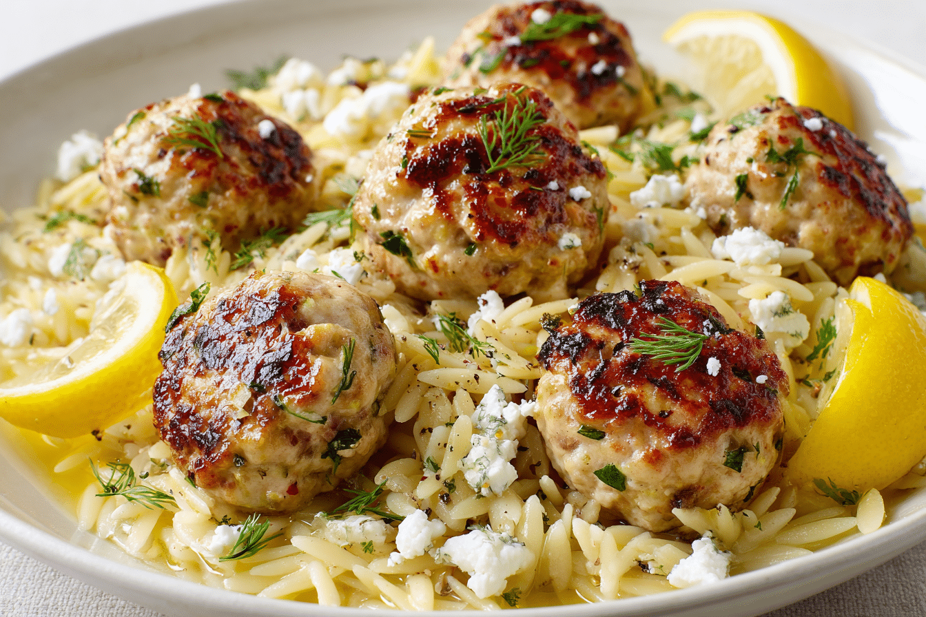 PrintJuicy Greek chicken meatballs baked with garlic, herbs, and feta, served over creamy lemon orzo for a Mediterranean-style one-plate meal.