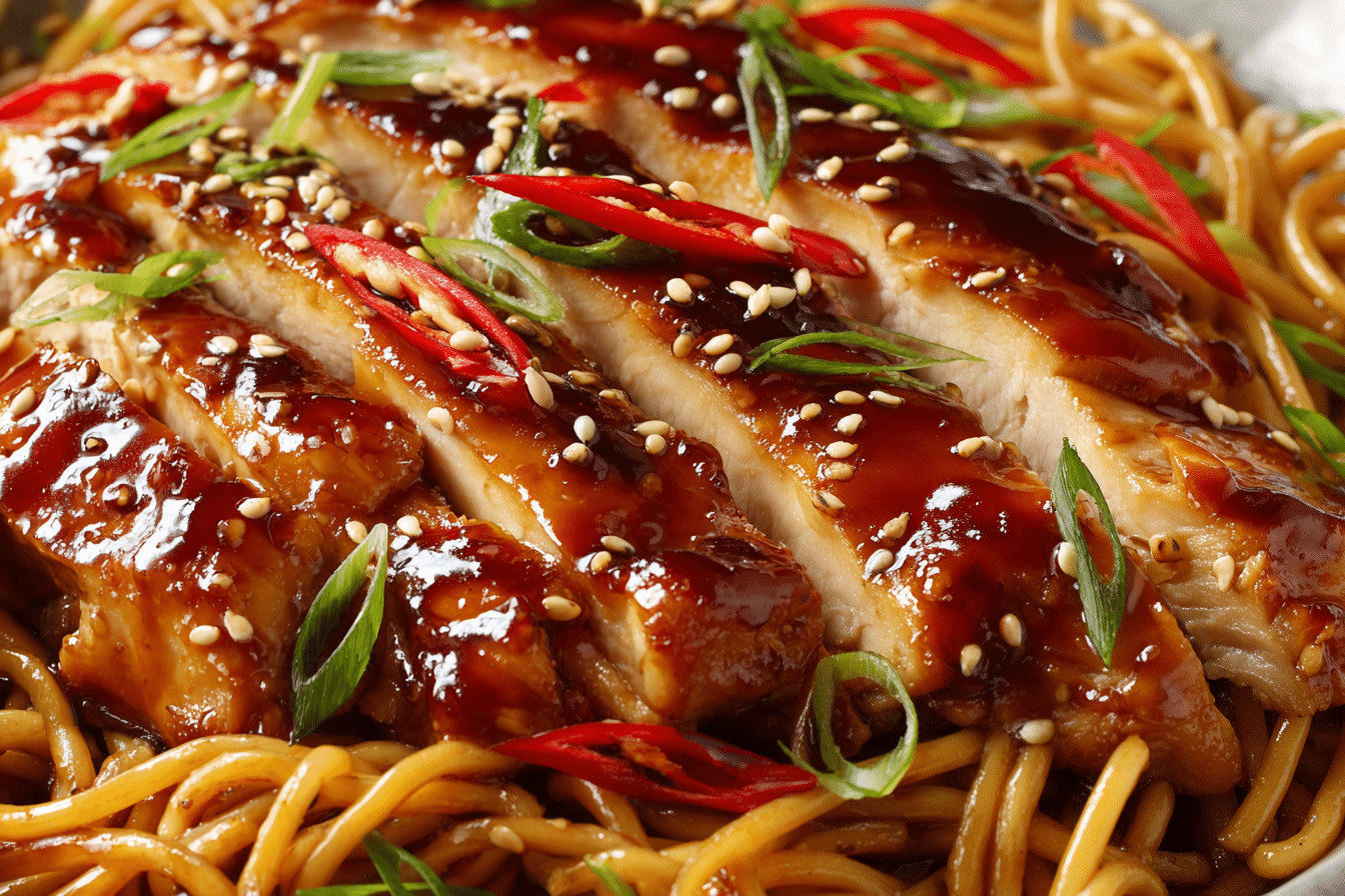 Tender chicken glazed in a sticky garlic sauce, tossed with noodles and topped with green onions and sesame seeds. Quick, bold, and irresistibly delicious!
