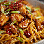 Tender chicken glazed in a sticky garlic sauce, tossed with noodles and topped with green onions and sesame seeds. Quick, bold, and irresistibly delicious!