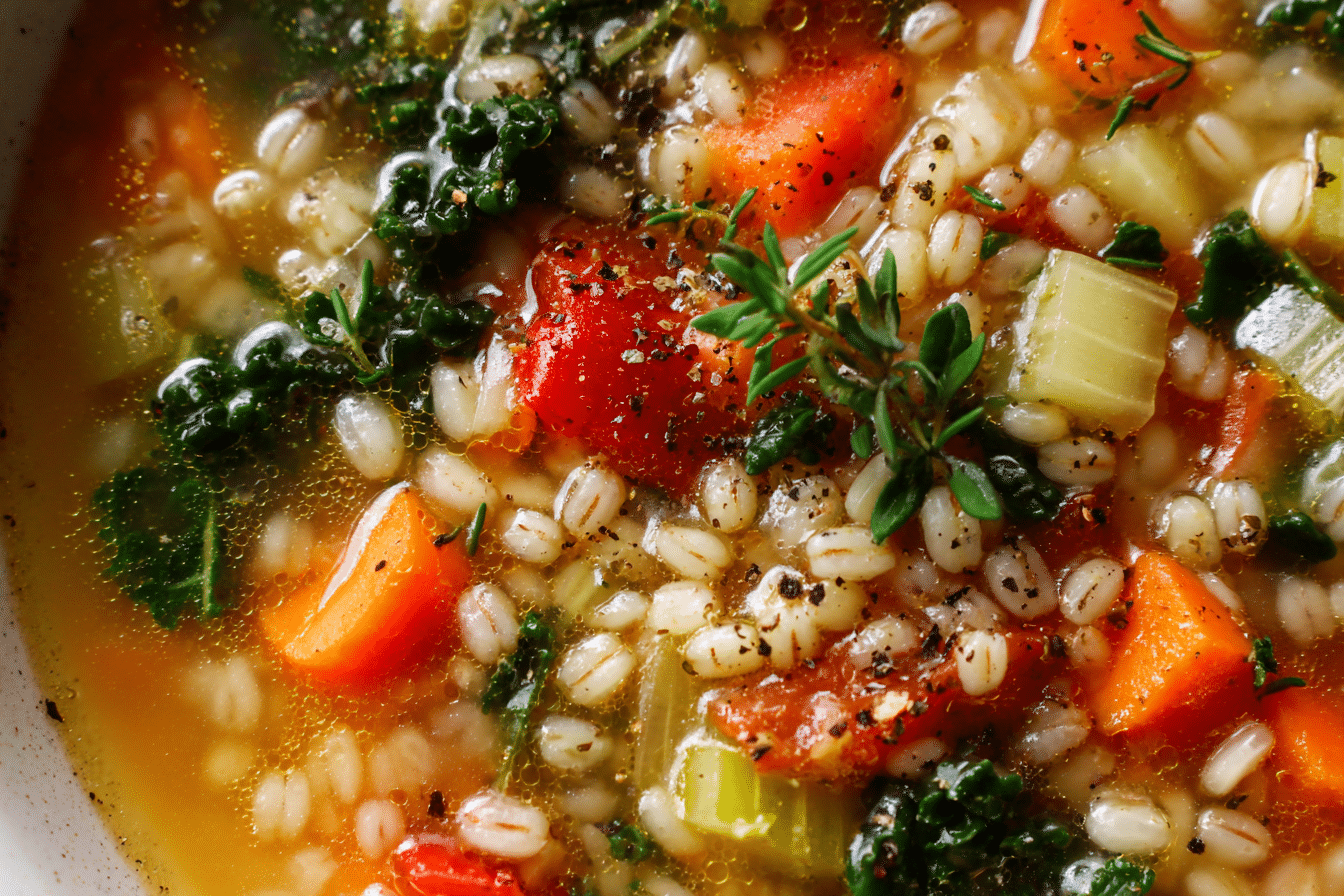 A cozy, hearty vegetable soup made with pearl barley, colorful vegetables, and savory herbs — naturally vegetarian and endlessly nourishing.