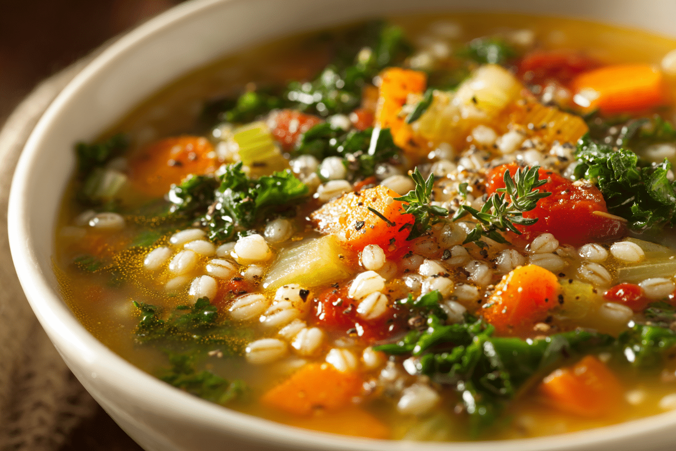 A cozy, hearty vegetable soup made with pearl barley, colorful vegetables, and savory herbs — naturally vegetarian and endlessly nourishing.